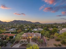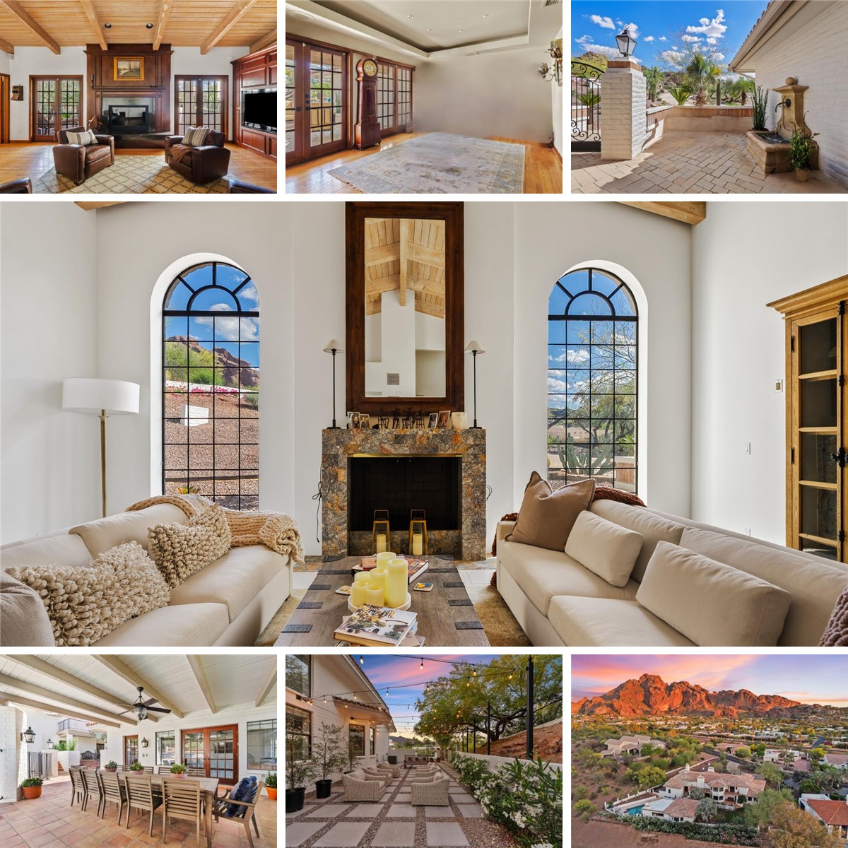 Family Estate with Casita in Camelhead Estates, Paradise Valley. The home is 5729 SF with 5 Bedrooms, 1 Office, 6 bathrooms, a large covered patio, a veranda along the back of the home, and an Outdoor Cocktail Terrace for 2 to 20 with mountain views. Spacious 3 Car Garage.